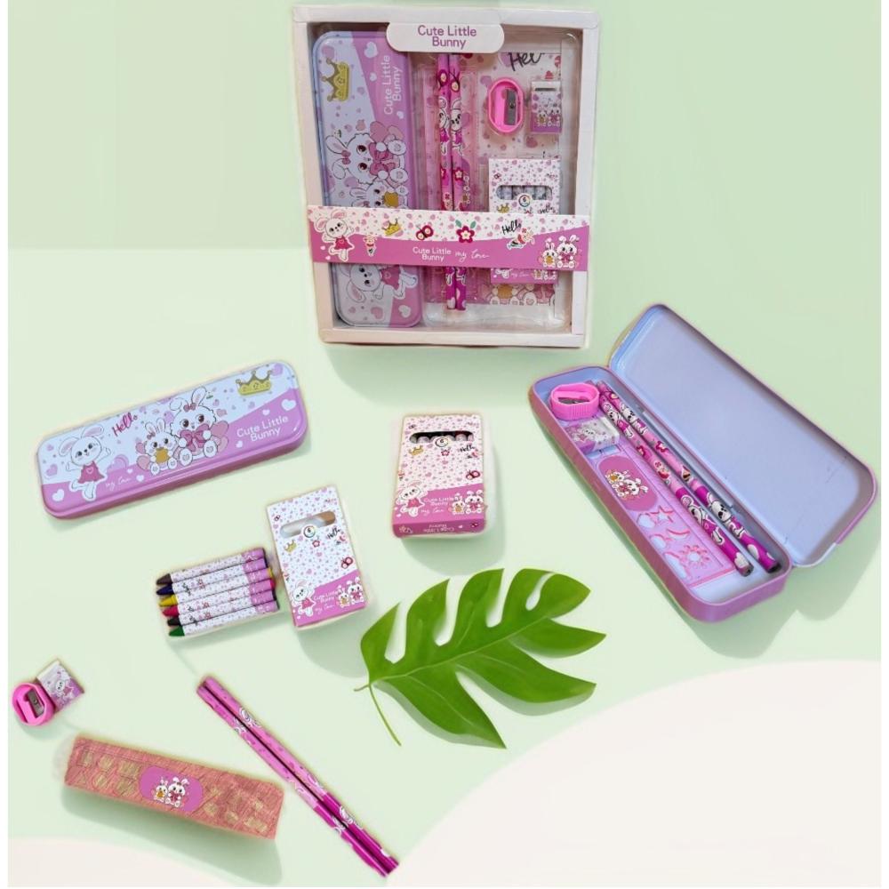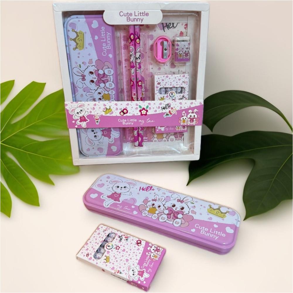 مقلمة معدنية ، اقلام رصاص ، علبة اقلام تلوين ، مسطرة ، ممحاة ،، براية